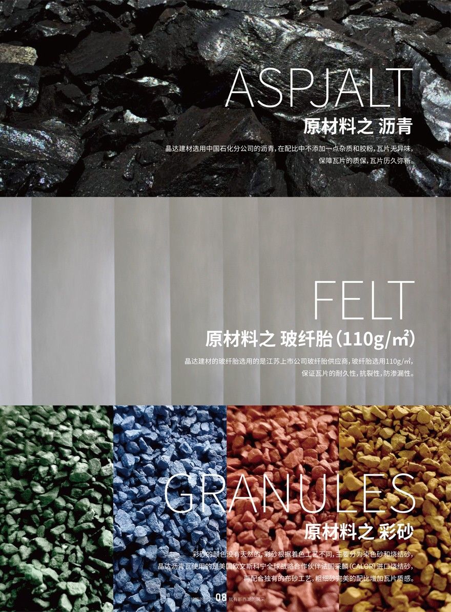 | 品名 | 產(chǎn)地 | 瀝青 | 載體 | 彩砂 | 特點(diǎn) |
